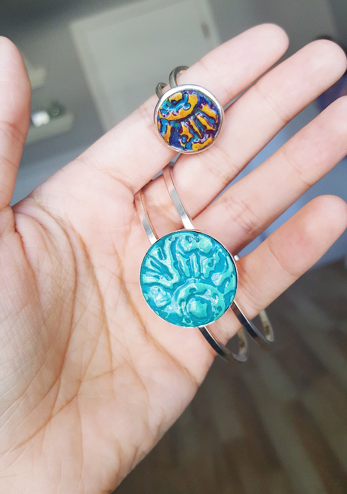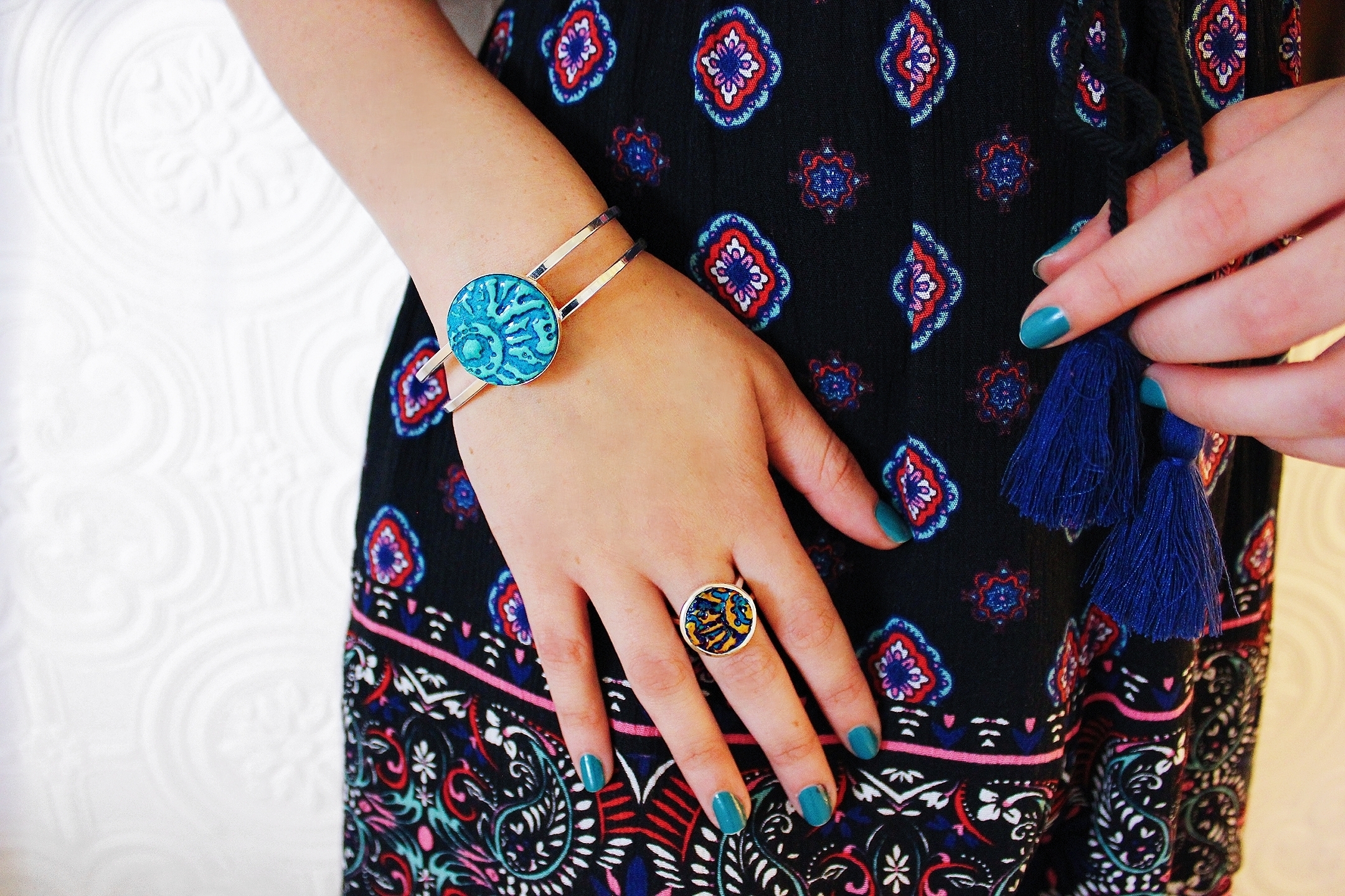 She makes, necklaces, hair pins, rings, earrings and bracelet so you can match or you can get different prints to style up and add a pop of color to any outfit! Her jewelry is colorful and vibrant which makes it so much fun!